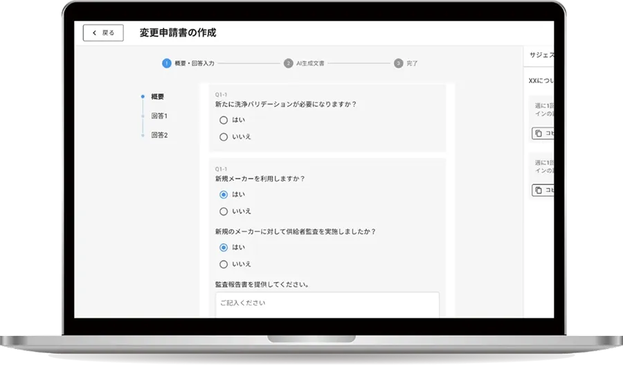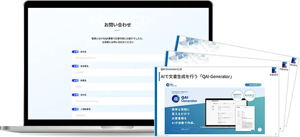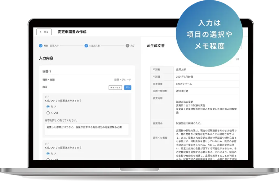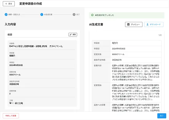 文書に必要な情報を入力すると、AIが文書を作成してくれます。氏名や日付、タイトルなどの基本情報を網羅しているほか、カスタマイズして独自のフォームを作成することも可能です。QA業務の高度化・煩雑化による 品質の不安定化や供給不安を解決します!